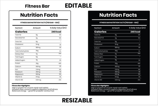 Fitness Bar, nutrition facts, nutrition, nutrition label, calories in food, nutrition info, supplement facts, vector template