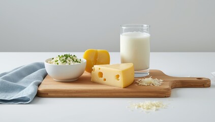 Fresh dairy items such as cottage cheese, swiss cheese, and a glass of milk used in balanced diet planning