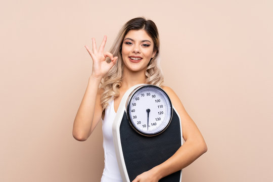 Teenager girl with weighing machine over isolated background holding a weighing machine and doing OK sign