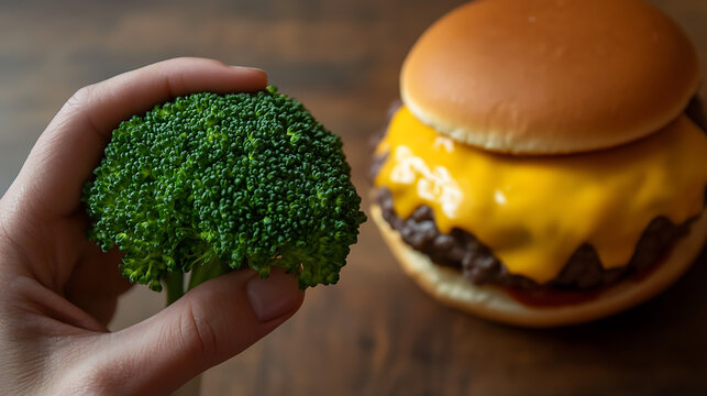 Dilemma: a hand holds green broccoli in focus, juxtaposed with a blurry cheeseburger. Healthy vs. indulgent choices, a common dietary struggle. The photo sparks reflections.