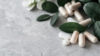 An aesthetic arrangement of assorted capsules alongside fresh leaves, symbolizing a blend of nature and health, perfect for representing wellness and dietary supplements.