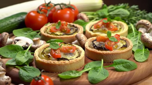 Delicious Vegetable Mini Tarts Displayed On Wooden Cutting Board Fresh Ingredients
