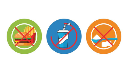 Illustration showing prohibited unhealthy food items including fast food soda and refined sugar representing common dietary restrictions for better wellness