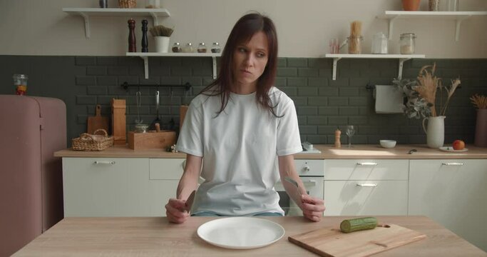 Woman sitting at table, looking sad and bored with diet not wanting to eat slice of cucumber. Healthy nutrition and dieting eating