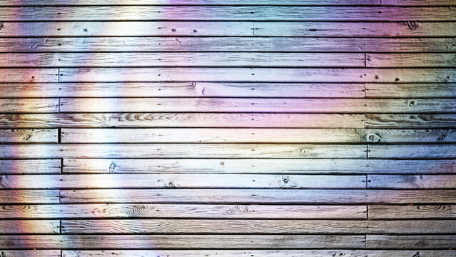Colorful iridescent light diffraction creating a moving circular pattern on wooden planks