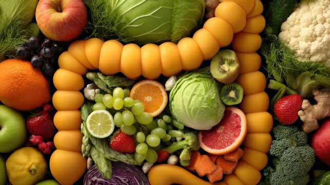 A vibrant arrangement of colorful fruits and vegetables, artfully shaped to resemble the human digestive system, highlighting nutrition and health.