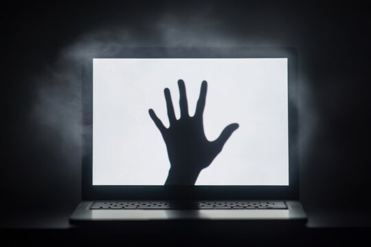 A hand reaching out from a laptop screen, symbolizing the invasive and harmful nature of cyberbullying, with the victim's silhouette in the foreground