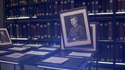 Framed portraits of a military officer displayed on tables in a grand library, surrounded by stacks of documents and safeguarded by a futuristic security system with glowing blue lines