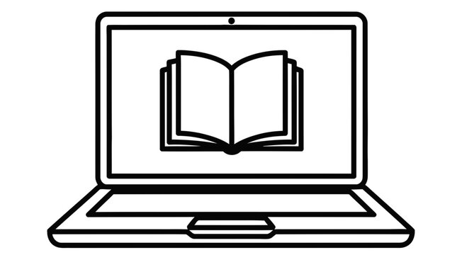 Minimalist line art icon of an open book on a laptop screen, symbolizing digital learning, e-education, virtual classrooms, online courses, and remote academic studies