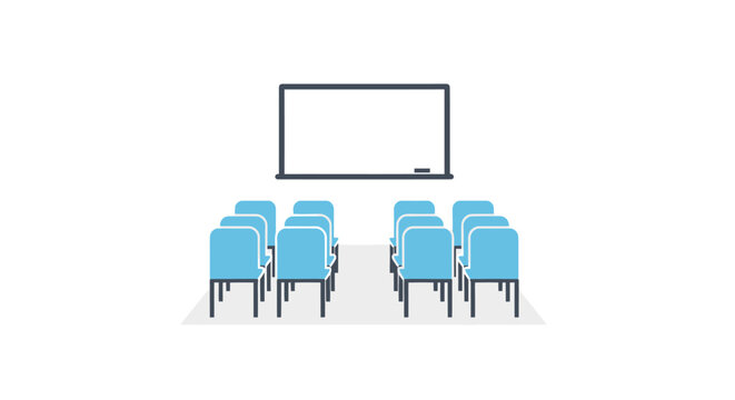 Empty classroom or meeting room with blank whiteboard and blue chairs.