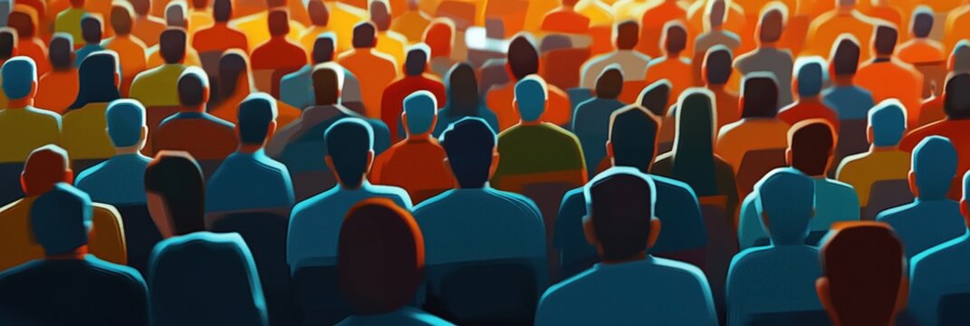 Diverse Audience at Event, Colorful Crowd, Engaged Participants, Vibrant Atmosphere, Back View of Attendees, Varied Clothing Styles, Dynamic Lighting