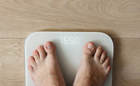 Man weighing himself - male bare feet stepping on white digital floor scales at home: close up view. Measuring weight, control, wellness and diet concept