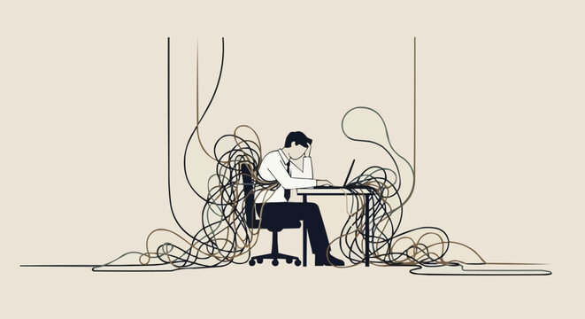 A person sits overwhelmed by numerous pop-up windows, feeling the effects of digital burnout and fatigue, tech overload concept