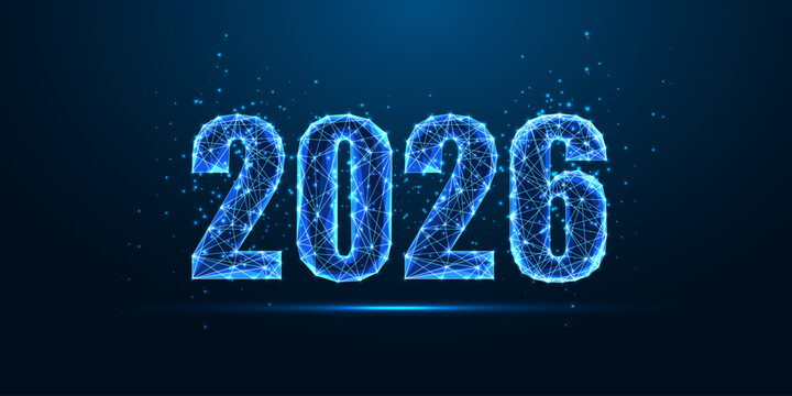 Futuristic glowing 2026 year in digital low poly style, innovation and tech future concept