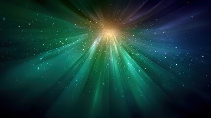 A mesmerizing digital artwork featuring vibrant rays of green and blue light, converging towards a bright center, creating a sense of depth and motion, blurred green background for Christmas
