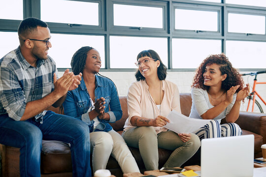 Applause, smile and business people with creative ideas, project achievement or deal on office sofa. Celebration, men and women at digital agency with design, teamwork and winning proposal on couch