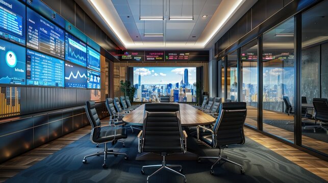 Modern conference room with digital connectivity icons