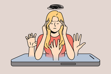 A person experiencing remote work burnout surrounded by digital notifications, conveying telework fatigue and overwhelming office environment.