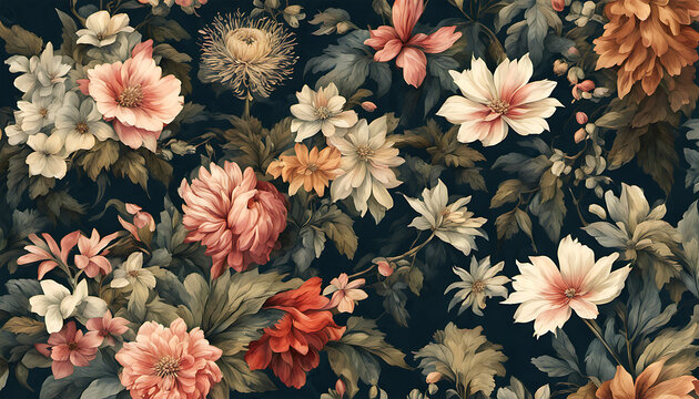 beautiful fantasy vintage wallpaper botanical flower bunch,vintage motif for floral print digital background.generative ai.