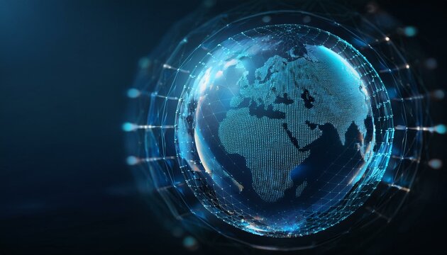 A glowing, digital globe surrounded by lines and dots on a black background.