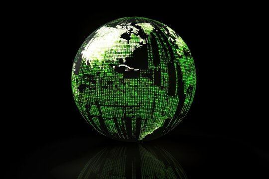 Data processing visualized on a glowing globe with green binary code against a black background, data processing over globe on black background