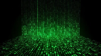 Green Binary Code Waterfall Against Black Background With Glowing Digital Stream and Abstract Matrix Data for Technological Computer Cyber Encryption