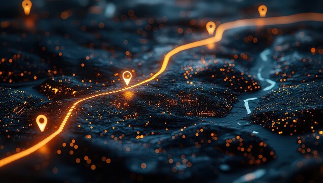 Map with glowing location pins and an orange path line on it.