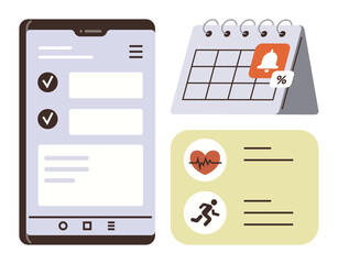 Health management, lifestyle planning, digital organization, fitness tracking, task management, scheduling. Smartphone interface with checklist, calendar alert health metrics icons. Health
