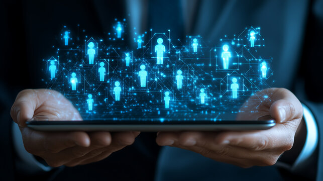 Glowing blue digital network connecting human icons