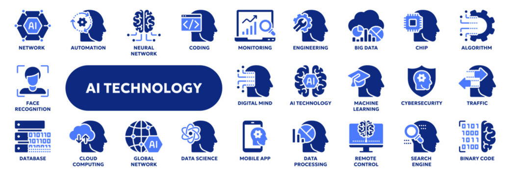 Artificial intelligence set of web icons in line style. AI technology for and mobile app. Machine learning, digital technology, and cloud computing networks. Outline icon set.