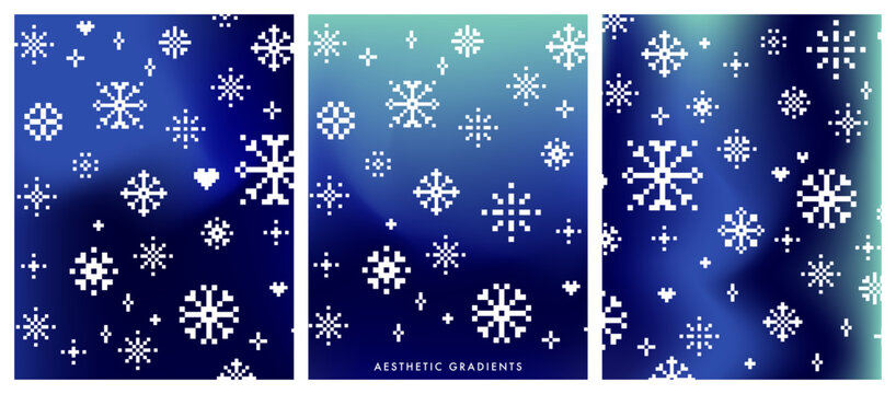 Pixel snowfall with abstract aurora gradient background. Dark blue and green color gradation. Retro 8 bit snowflakes pattern. Y2k inspired winter northern sky bg set for modern digital holiday design
