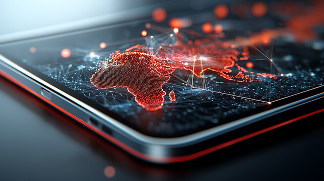 Dynamic glowing global data network on tablet secure connection visualization technology digital world close-up conceptual innovation