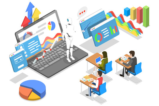 Isometric  Concept of Teacher Bot, Artificial Intelligence Technology.