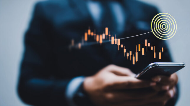 Navigating the Financial Landscape: A focused individual, intently monitors stock data on their mobile, overlaying a stylized growth target graphic, symbolizing strategic financial planning.
