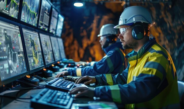 An engineer working in a control room in a vast mineral extraction site