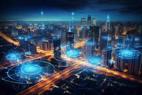 Aerial view of a smart city suburb featuring connected homes, green spaces, and advanced technology. AIG62