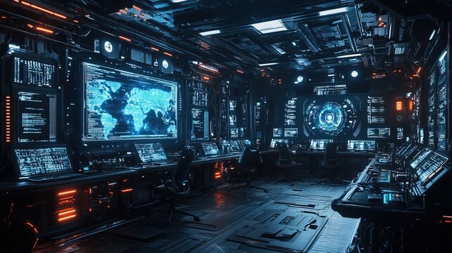 Futuristic data security room with glowing digital panels, cybersecurity theme, dark and intense