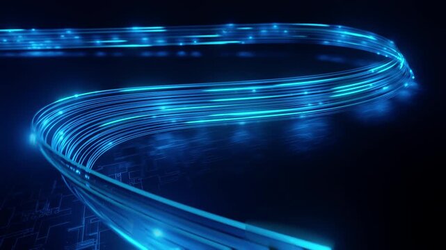 Dynamic blue fiber optic light trails. High-speed data transmission, global digital network, internet communication technology. Abstract background for modern tech themes.