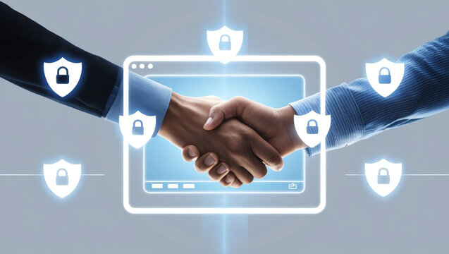 Two hands shaking through digital screen with safety icons, symbolizing trust and online security in social media interactions