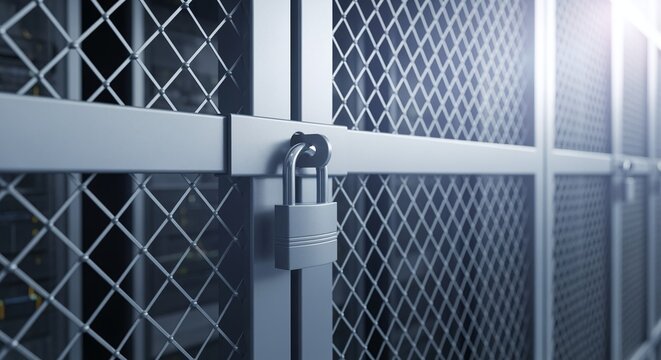 A metal lock lies on a circuit board. The scene represents security measures in the field of digital technology. Light reflects off both surfaces enhancing the visual elements.