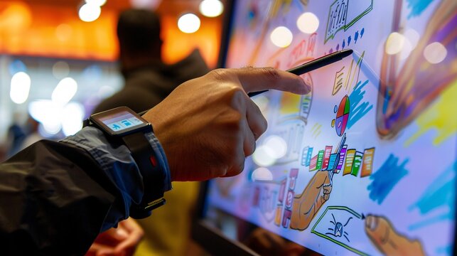 Hands using a stylus to navigate a presentation on a digital board during a business seminar