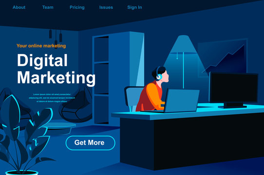 Digital marketing isometric landing page. Marketer working with computer in office website template. SMM and SEO technology, social media and web content promotion perspective flat vector illustration