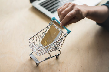Shopping online. cardboard box with a shopping cart logo in a trolley on a laptop keyboard. Shopping service on The online web. offers home delivery..
