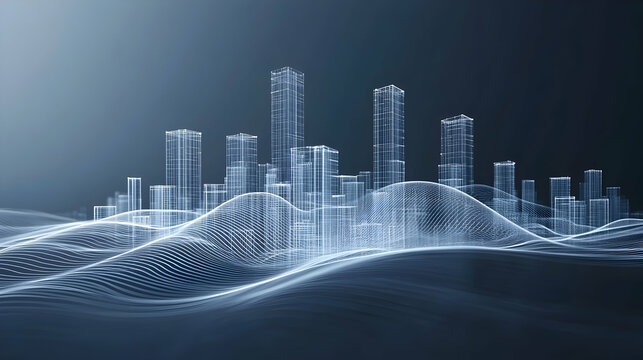 Wireframe city skyline on wavy terrain; futuristic urban design concept