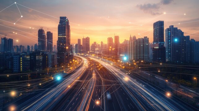 A panoramic view of a city skyline at sunset with a network of lines and dots connecting the buildings, representing the interconnectedness of the modern world.