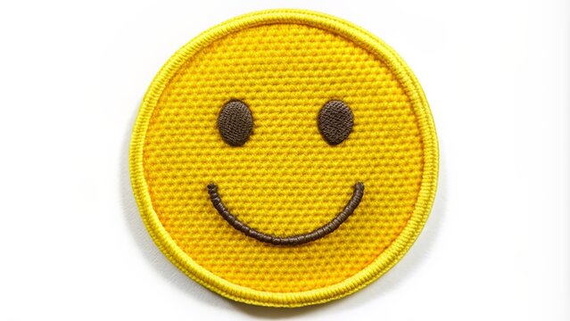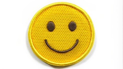 Bright yellow round smiley face embroidered badge with intricate stitching, isolated on a transparent background, perfect for creative designs and digital applications.