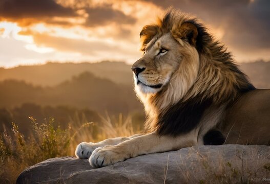 AI generated illustration of a lion lounging on a rocky outcrop under dramatic cloudy sky