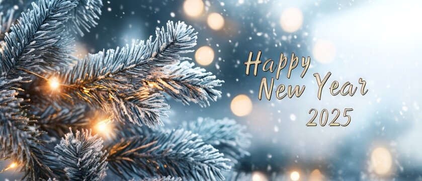 New year greetings card with snowy pine tree background