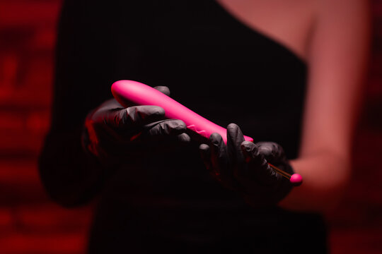 Burgundy stylish dildo for masturbation in the hand of a girl wearing black gloves on a red background. Nozzle for clitoral stimulation. Sex shop Adult store