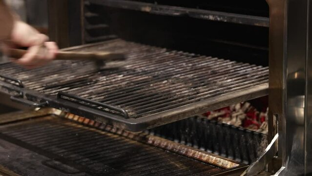 chef putting shrimp on wooden skewer and on charcoal grill oven. man cleaning rack with brush. fire flame and burning red embers inside. kitchen from a restaurant.hand using tongs to turn food